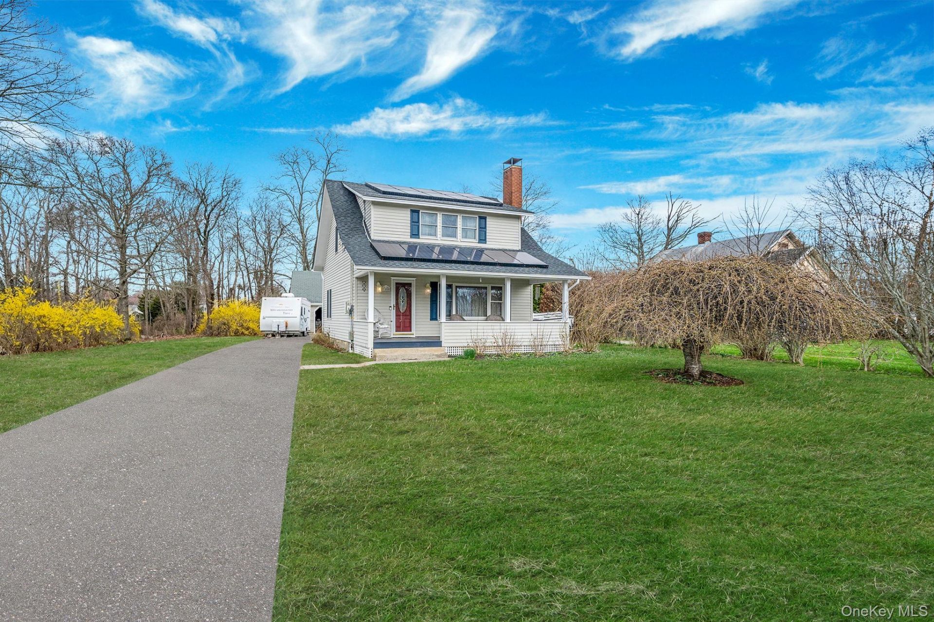 Nestled in the Heart of the North Fork, this Charming Move in Ready Home in Mattituck has 3 Bedrooms and 3 Baths. Close to Beaches, Strong's Marina, Wineries, Local Farmstands, Restaurants and Beloved Love's Lane. Enjoy your morning coffee on the Inviting Covered Porch. Or watch a movie Cozied up infront of the Fire Place that anchors the Living Room. Plenty of Cabinets and Counter Space in the Kitchen. Hardwood Floors on the First and Second Levels. Extra Living space in the Finished Basement for an Office and Media/Game Room. Plenty of Room for Cars and Toys in the 2.5 Car detatched Garage equipped with an Escalated Fast Charger AV Charging Station. Solar Panels on the Roof help reduce electricity costs and carbon footprint. A Must See! Peconic Bay Tax applies